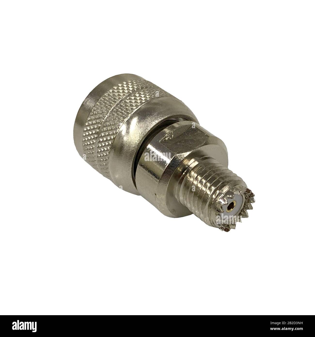 COAXIAL ANTENNA CABLE CONNECTOR, METAL PLUG - closeup images, isolated white background ideal for composition with radiocommunications theme Stock Photo - Alamy